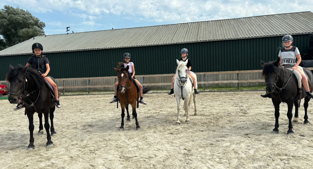 Tijdens het rijden leren de kinderen onder andere om te lichtrijden, om een pony voorwaarts te rijden en weer te laten stoppen en om te sturen in stap en draf. Wanneer de kinderen er aan toe zijn zullen zij ook hun eerste galop rijden. Ook voor het rijden geldt dat er elke startersles een ander thema is welke samen de basis vormen van het paardrijden. Na de starterslessen kunnen de kinderen doorstromen naar de groepslessen.